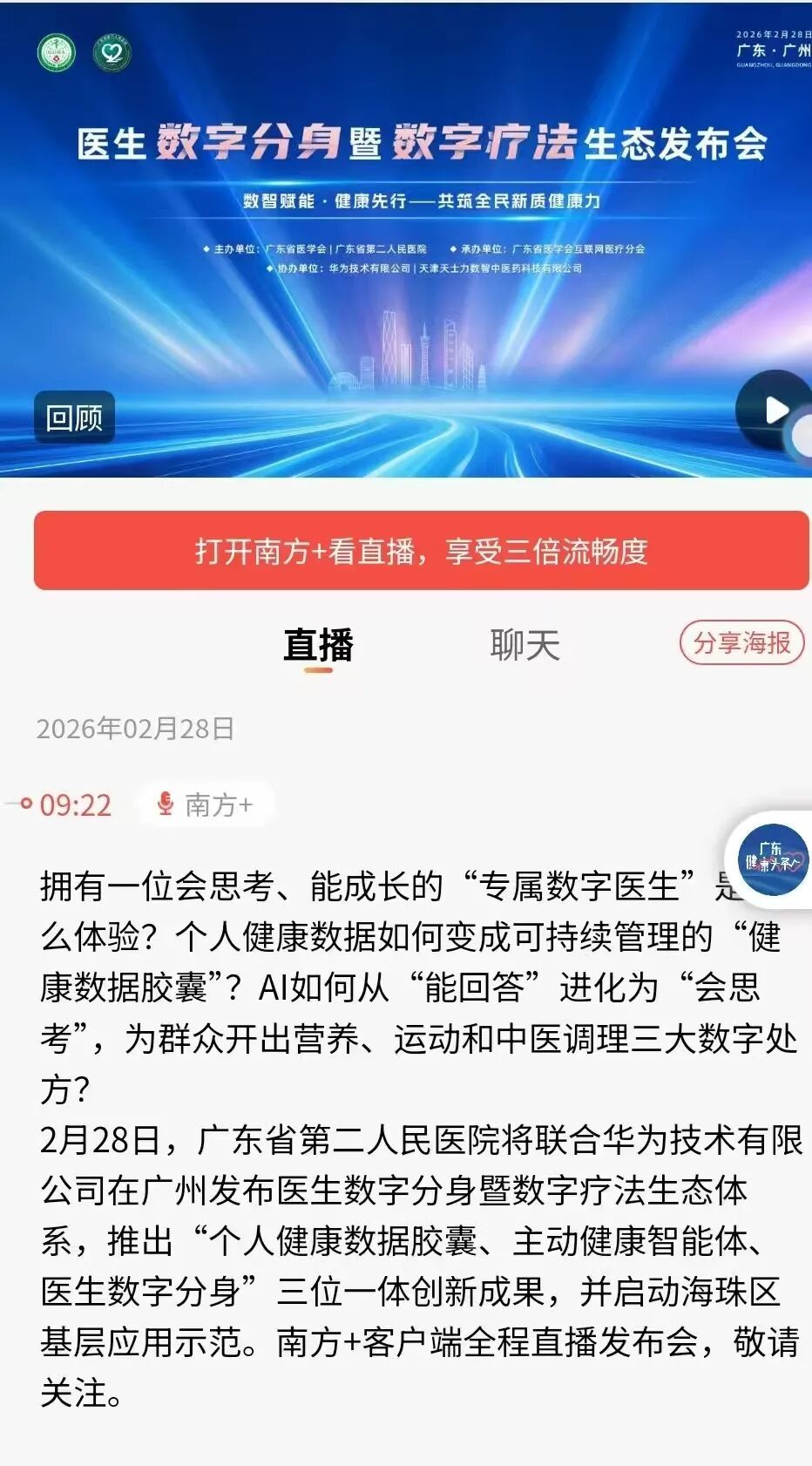2月28日,广东省医学会、广东省第二人民医院(以下简称“省二医”)主办的全国首个医生数字分身暨数字疗法生态发布会在广州举行。会上,正式发布省二医联合华为技术有限公司等合作伙伴,运用大数据、人工智能、云计算等信息技术,构建的“个人健康数据胶囊、主动健康智能体、医生数字分身”三位一体的数字疗法生态体系,启用全国首个会学习、能成长、高层次的“有灵魂”的医生数字分身,为群众提供个性化的“三大数字处方”,让每个人都能拥有一位24小时在线的私人专属保健医生。
