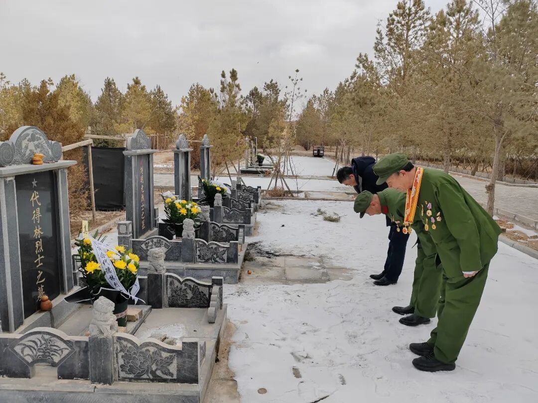 在武威民勤烈士陵园,松柏苍翠,庄严肃穆。张掖市爱国拥军促进会一行与一等功臣卢向虎及其战友共同伫立于烈士纪念碑前,向烈士陵园全体烈士鞠躬默哀。在烈士墓前,向在对越自卫反击战中英勇牺牲的代得林、常生贵、刘明元、沈承柏四位民勤籍烈士敬献花篮,默哀致敬。